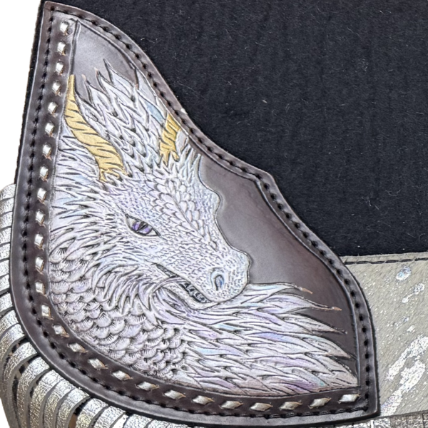 Limited Edition natural pad with hand-tooled and hand-painted dragon corner plates, the Dragon Rider – Silver is crafted for riders who want bold, modern style backed by proven 5 Star performance. Featuring striking silver detailing and fierce dragon artwork, this pad delivers a sharp, high-contrast arena look while providing the comfort and protection serious competitors demand.
