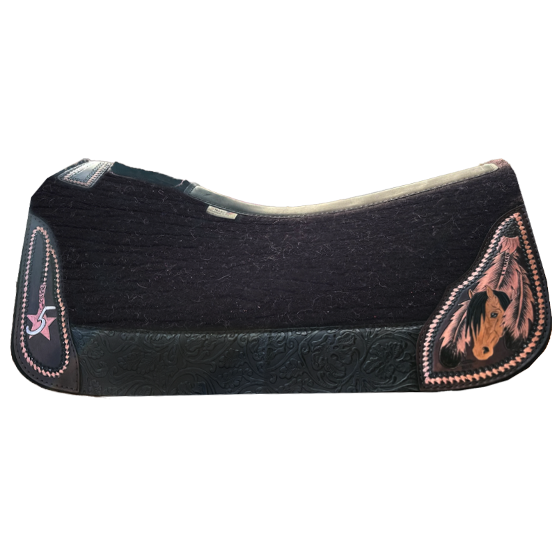 Limited Edition pad with black cowboy tool wear leathers and hand tooled and hand painted and buck stitched corner plates.
